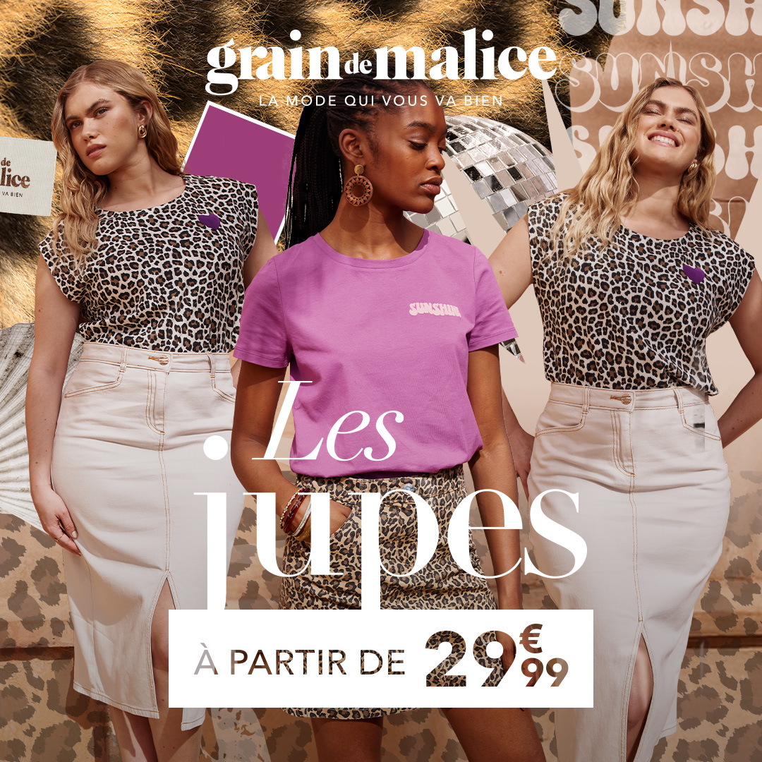✨ Jusqu’au 22 avril, la jupe se décline en différentes longueurs, couleurs et imprimés pour un style facile et tendance, du 34 au 50 chez Grain de Malice ! À partir de 29,99€ seulement !